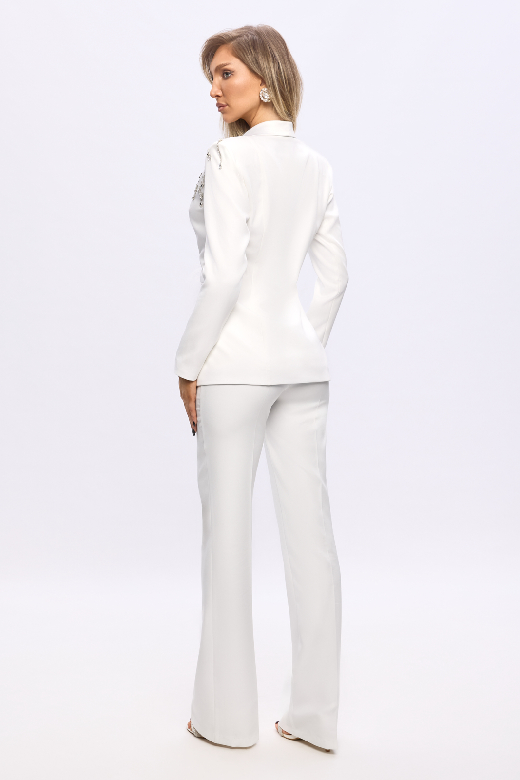 Acest compleu elegant format din sacou si pantaloni este o piesa statement, ideala pentru evenimente speciale. Sacoul alb are un croi cambrat, cu decolteu adanc in V si rever satinat, care confera un aer sofisticat. Detaliile aplicate cu margele si strasuri pe umar si talie, combinate cu penele delicate, adauga o nota glam si exclusivista. Pantalonii au o croiala evazata, care alungeste silueta si echilibreaza perfect tinuta. Materialul este fin, cu tinuta, accentuand liniile corpului fara sa stranga. Este un outfit perfect pentru femeile care vor sa atraga toate privirile si sa se simta puternice, feminine si rafinate.