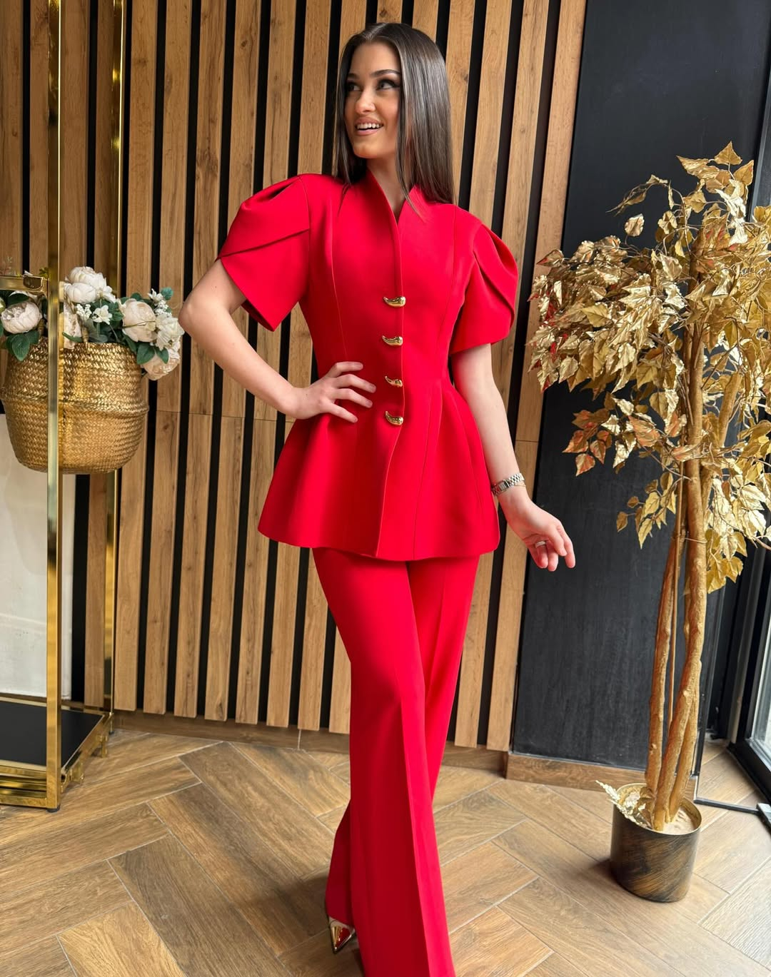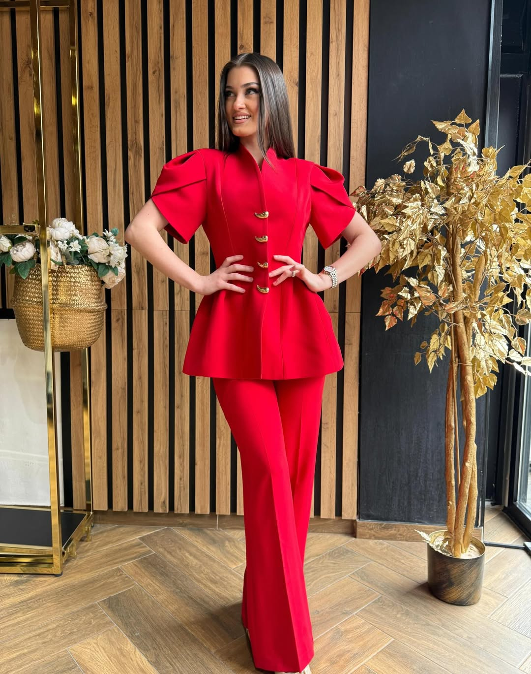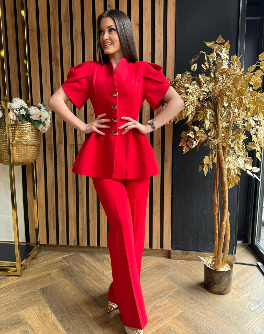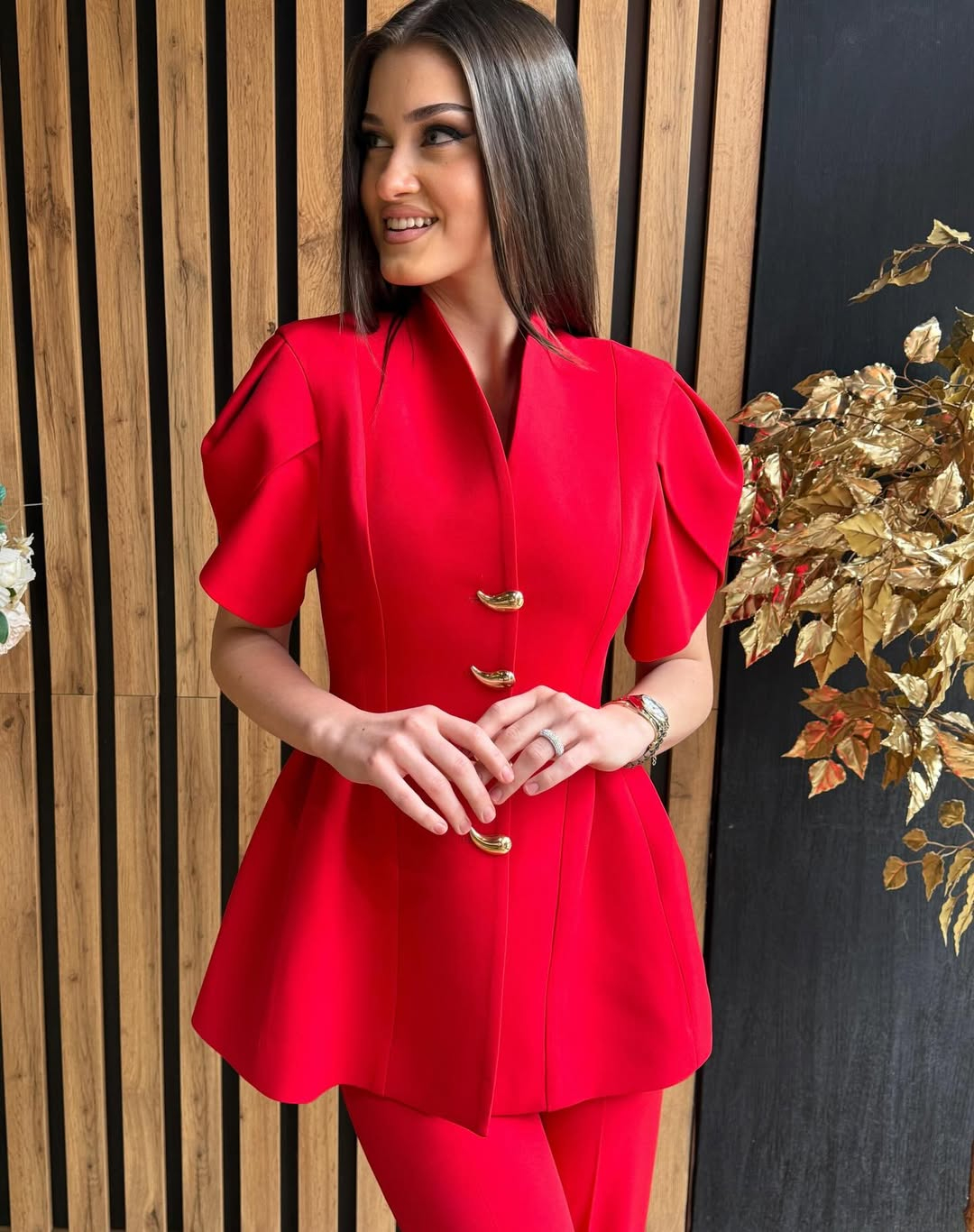 Compleu rosu cu accesorii aurii